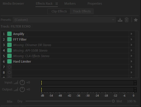 Warning: 7 of the 21 effects referenced by the file could not be found: EKramer DR Stereo, Aphex Vintage Exciter Stereo, JJP-Vocals Stereo, RVox Stereo, L1+ Ultramaximizer Stereo, API-550B Stereo, CLA Effects Stereo.