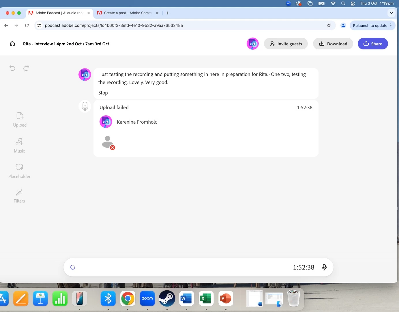 I just recorded an hour and 52 minutes of content with a remote client this morning, only to have an error message at the end that said Upload Failed. Can I get hold of my recording somehow? Also, is there a golden rule here? Should I only record 30 mins at a time? What is the limit - if there is a limit, so that I dont end up in this situation again?