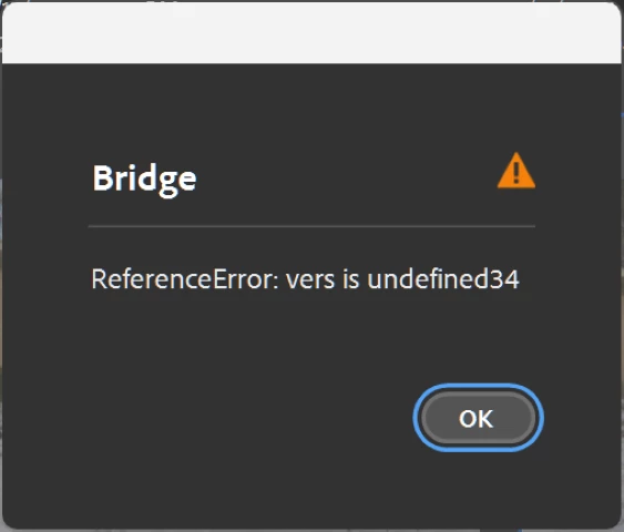 In Bridge, I wanted to use a path to a file elsewhere. I right-clicked to bring up the context menu on the Thumbnail and selected "Copy path." An error dialog appeared stating, "ReferenceError: vers is undefined34."