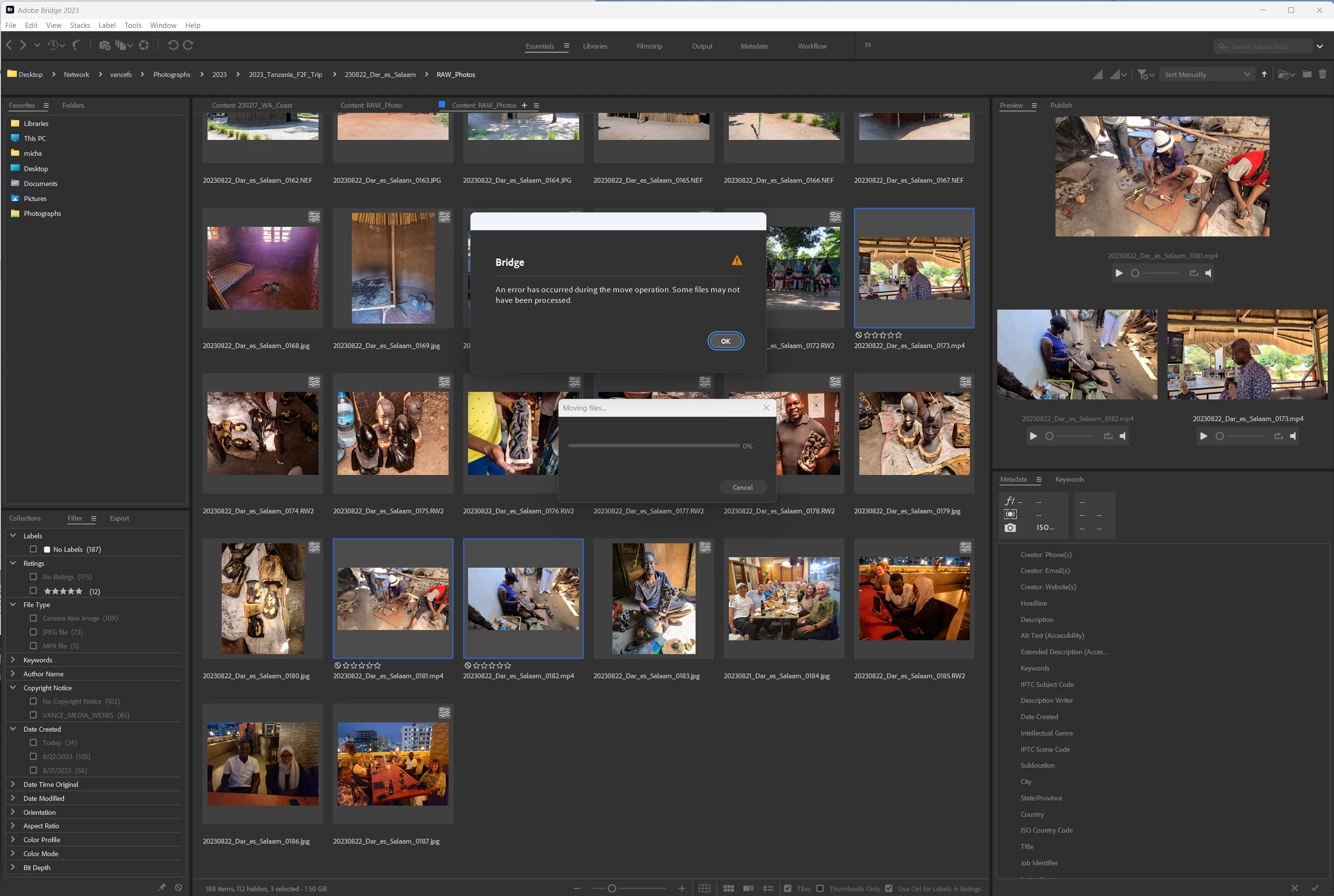 When selecting a single or multiple items in Bridge, right-clicking, and selecting the "Move to" function to move the item(s) to another folder, the "Move to" command fails to function after selecting the destination. There is no action at all.