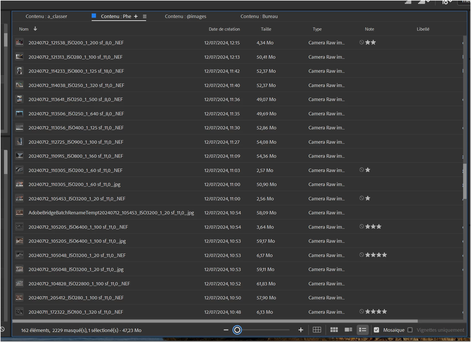 Bridge is loosing head after renaming hundreds files (swap filename between current file and the next), loose extension (put JPG instead of keeping NEF). Some files are named AdobeBridgeBatchRenameTemp120240712_105453_ISO3200_1_20 sf_11,0...