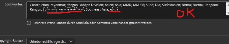 Burmese keywords are not shown in the keyword panel. They are available but not shown in the panel. In the EXIF-Info dialogue they are displayer correctly.