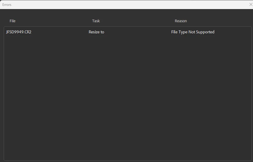 Simple workflow not working error mesage states "File type not supported" when resizing CR2 files
