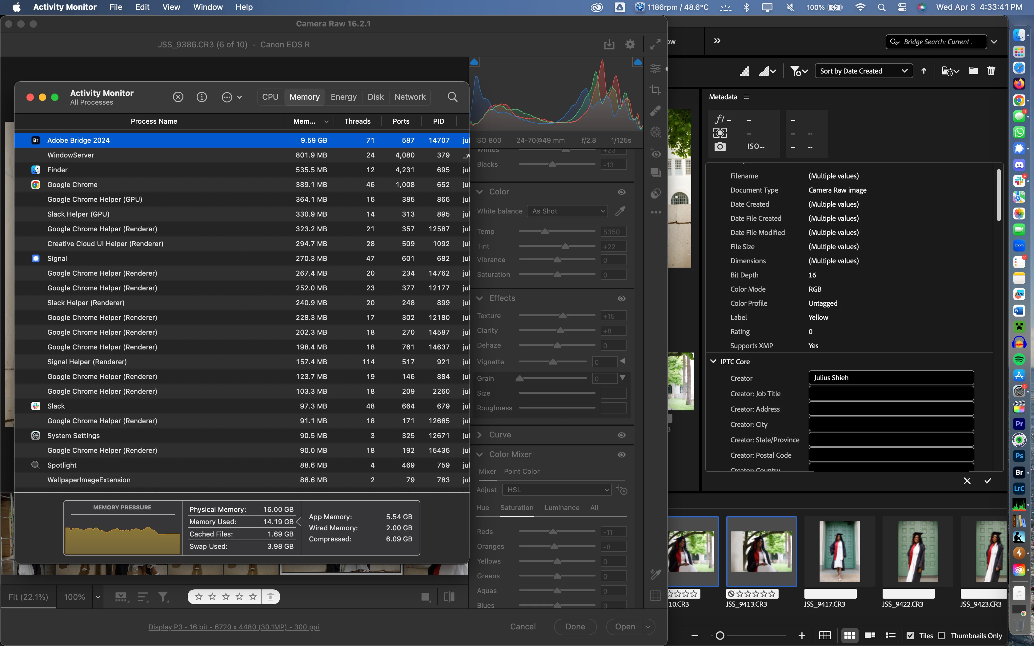 I'm using a MacBook Pro 13 M1 with 16gb RAM running MacOS 14.3. I'm on the latest version of Bridge and Camera Raw (Bridge 14.0.3 and Camera Raw 16.2.1).