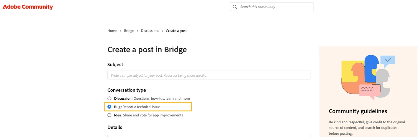 When logging a new bug report, first, create a new post and select "Bug" under "Conversation type".