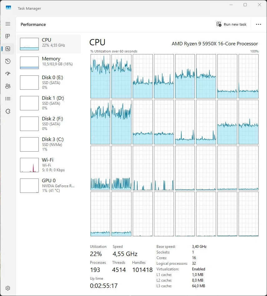 11. almost immediately I observe a very high CPU usage level (see attached screen dumps of Task Manager)