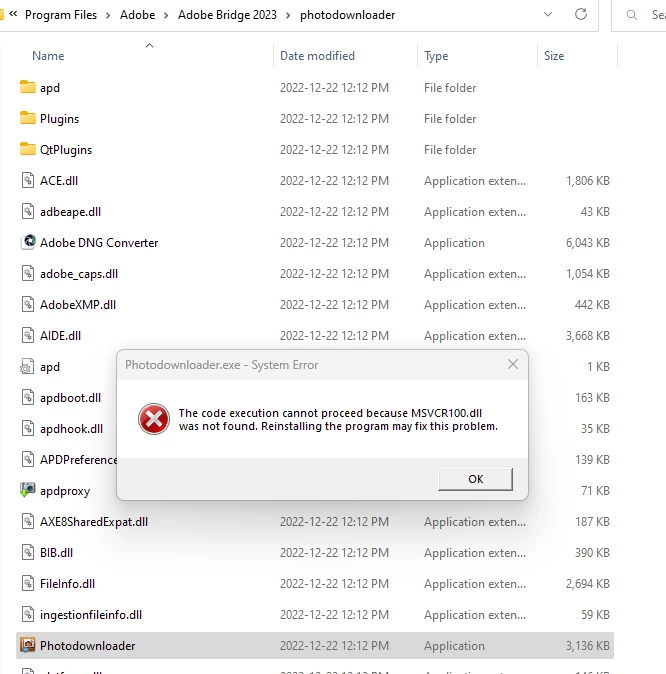 Tried to start the PhotoDownloader directly and get a message saying could not proceed due to MSVCR100.dll was not found (which appears to be a C++ distribution.....and I have installed the additional software as well). BUT it should have been included with Bridge as I downloaded and installed using the Creative Cloud.