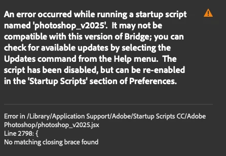 The Photoshop 2025 startup script is not loading and is disabled in Bridge 2025. When I re-enable it and restart Bridge, I get this message (screenshot).