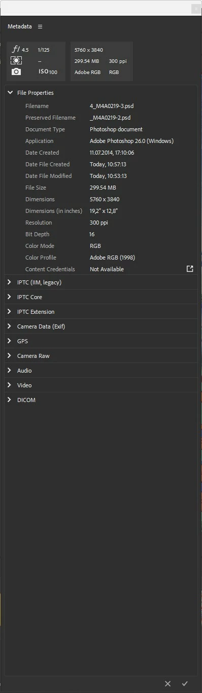 - Enable all properties in "File Properties", "IPTC (IIM, legacy)" and "IPTC Core"