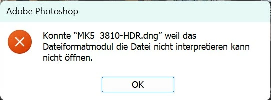 Unsable to open new merged DNG direct out of Camera Raw in Photoshop. Error: "Could not open "file.dng" becuase the file-format module cannot parse the file"
