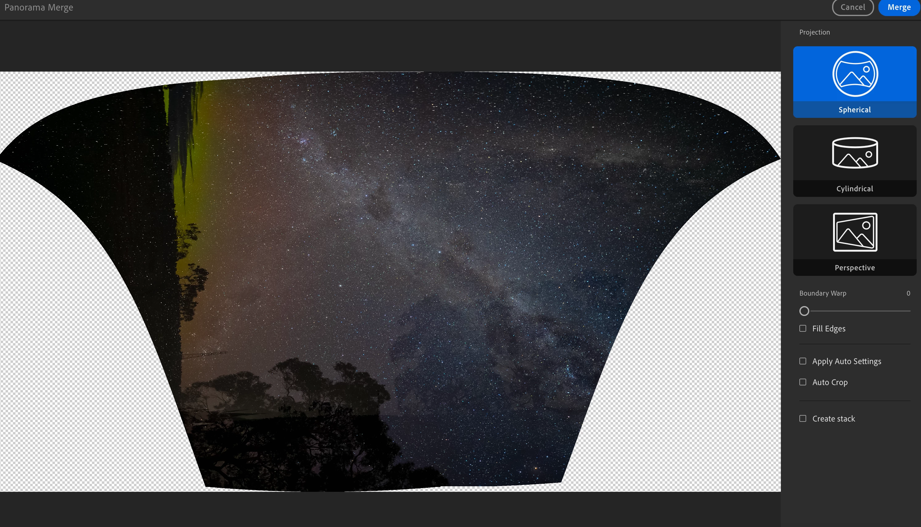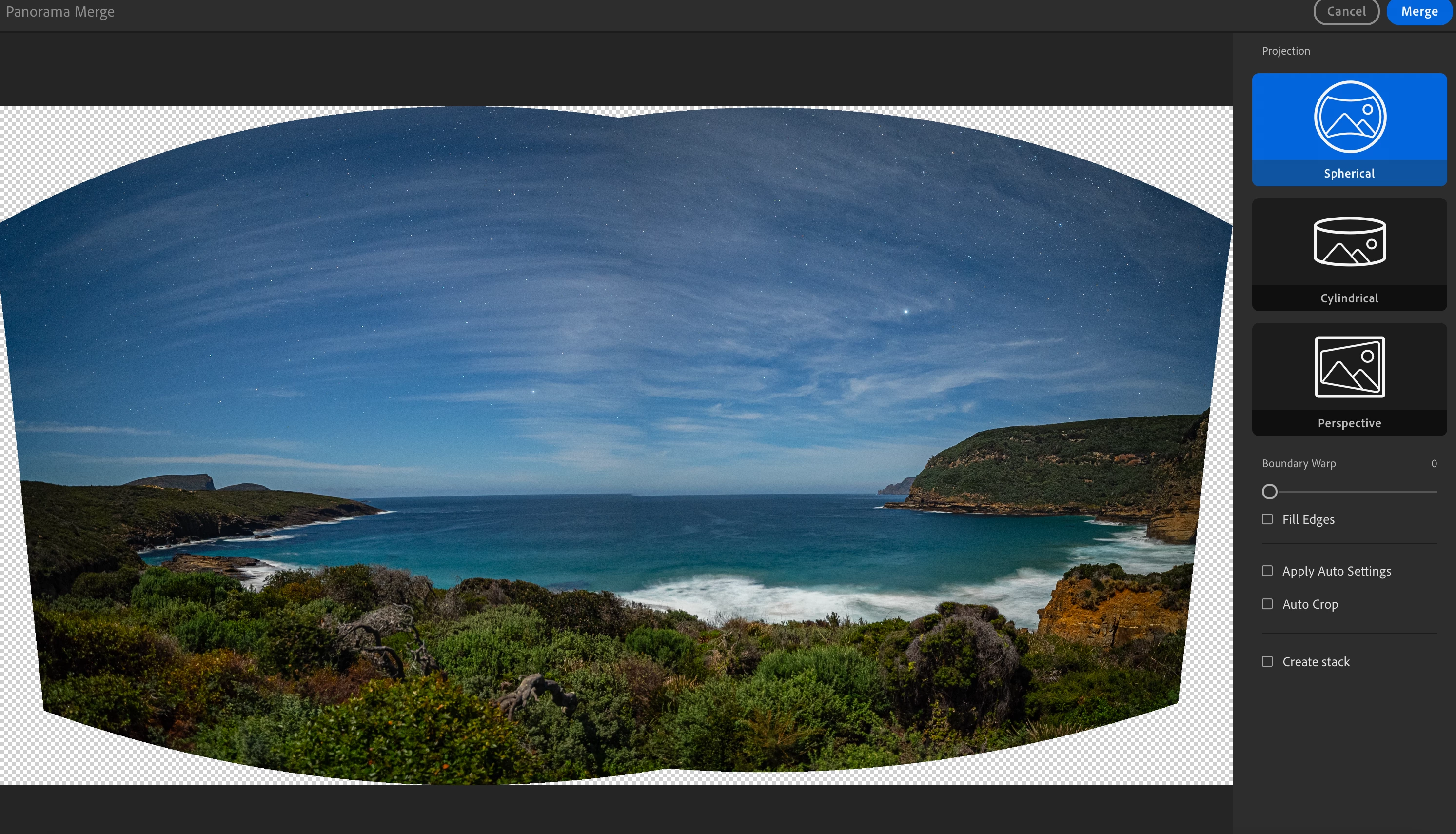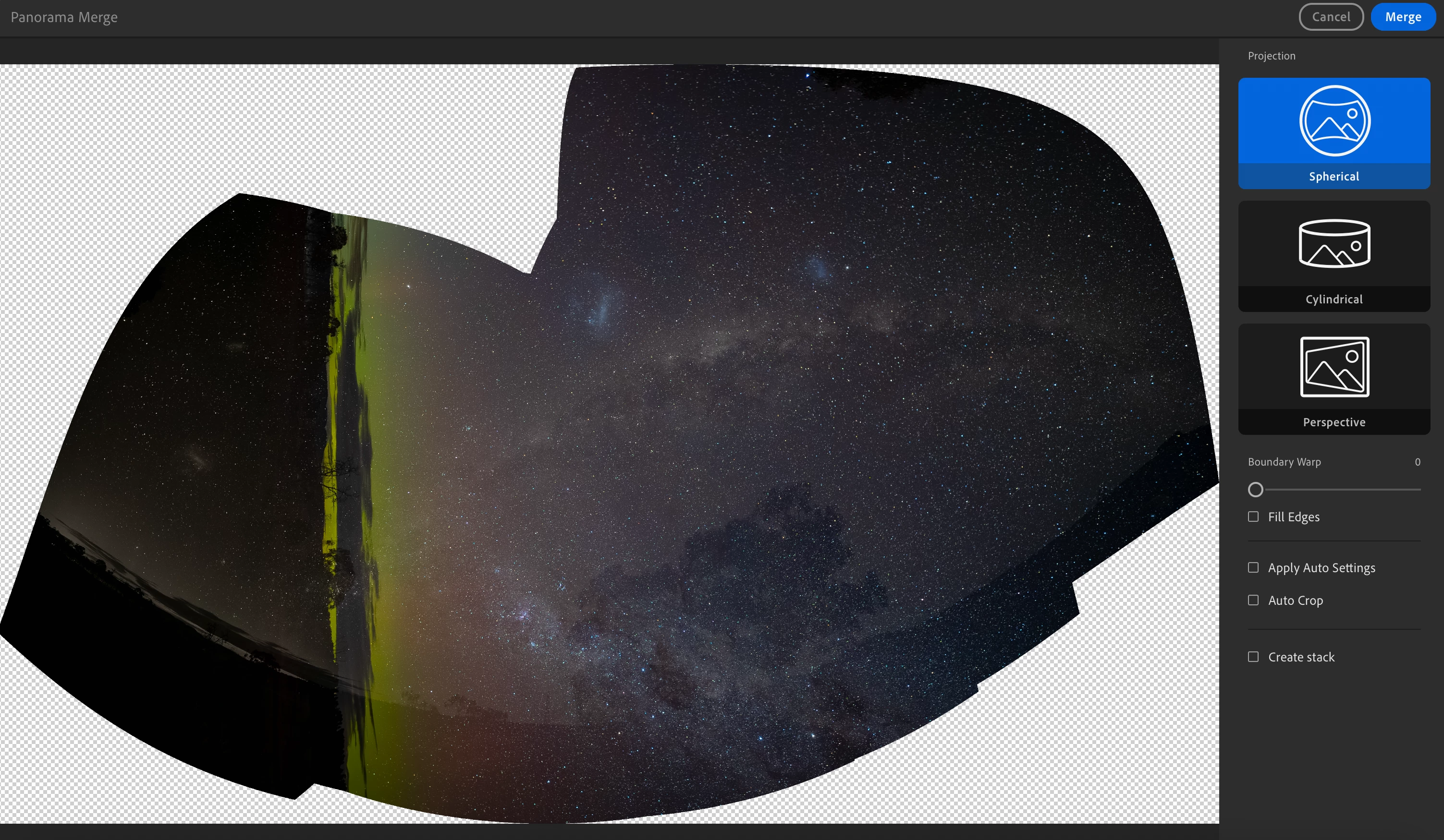 The images are all shot on Sony A7IV in ARW and then imported into Lightroom off the camera. I select them in the Detail's view and select "Photo Merge > Panorama Merge" and untick the Auto settings.