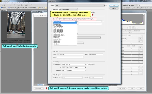 Long filenames are truncated to approximately 63 bytes in ACR 8.3/8.4's Save Image... panel. The name truncation happens to the file saved on disk and is visible in the Example Filename area.