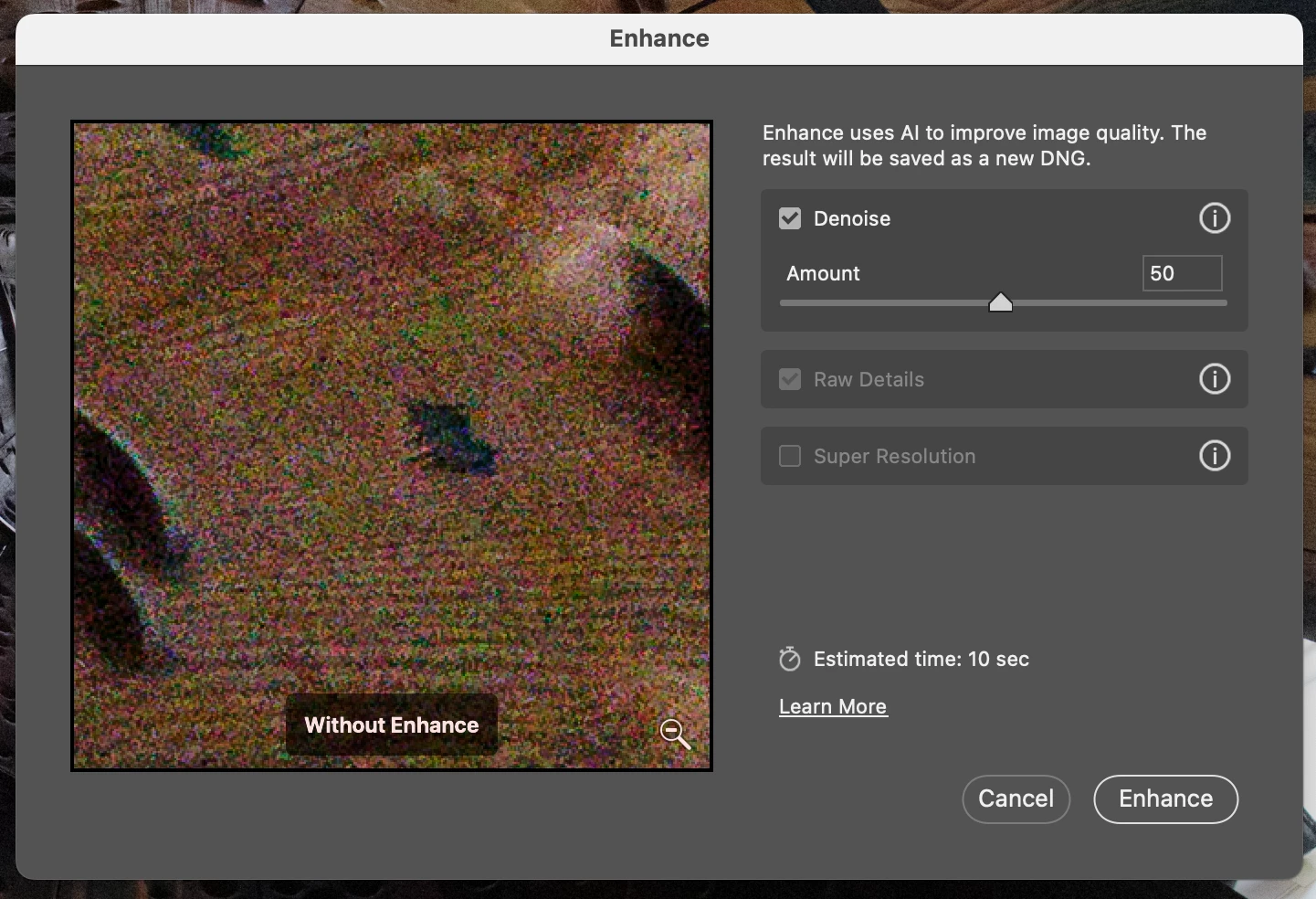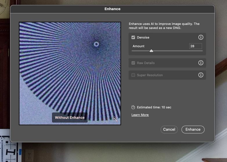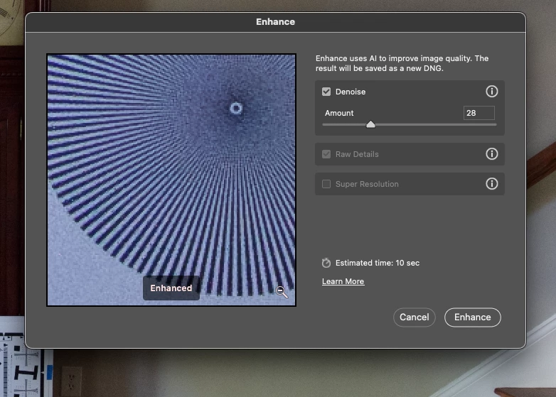 Hello Rikk. Thanks for your response. Just took this high iso DNG with my Pentax K3iii. I imported into Lightroom Classic v 12.3 and saw no difference in the Denoise preview window and no change to the resulting enhanced DNG. I can't seem to upload the DNG. It keeps getting rejected with an error. I responed to you email with the attachment if that works.