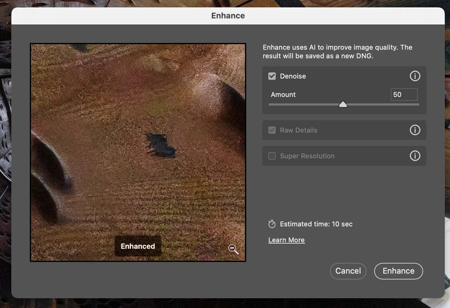 Interesting! Yet it clearly doesn't do it at all. Also tested the file in camera raw and it gives the same result of no noise reduction whatsoever. I also downloaded the image you linked to from dpreview and it does do a little bit of reduction there, but very badly and patchy. Far worse quality than what I get on my images (not from the same camera) and very strangely patchy and actually killing structure that obviously belongs in the image. Here for example is some woodgrain in the image @johnrellis linked to that gets pasted over by enhance (run in camera raw in this case but there is no difference with Lightroom). It have never see it do anything like this with images from my camera. In fact it often finds detail you can't even see easily in the original. Here it just pastes over the grain. Clearly it is not tuned correctly for this camera.