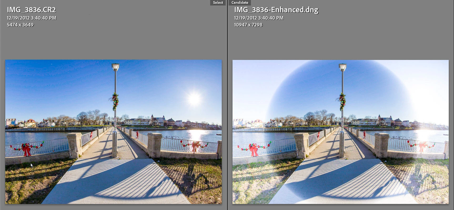 I'm using LrC 11.1 on a Windows 10 system with Canon 8-15mm F4 Fisheye USM lens and Canon EOS 5D MKII camera. When processing a CR2 file with Photo> Enhance> Super Resolution the resulting DNG file has a circular negative vigenette applied. I tried with GPU both enabled and disabled with the same results. Camera Raw 14.1 produces a DNG file with the same circular negative vigenette as shown below. If the file is exported to a TIFF file it does not exhibit the vignetting when applying Enhance Super Resoltution. It only happens with raw CR2 files.