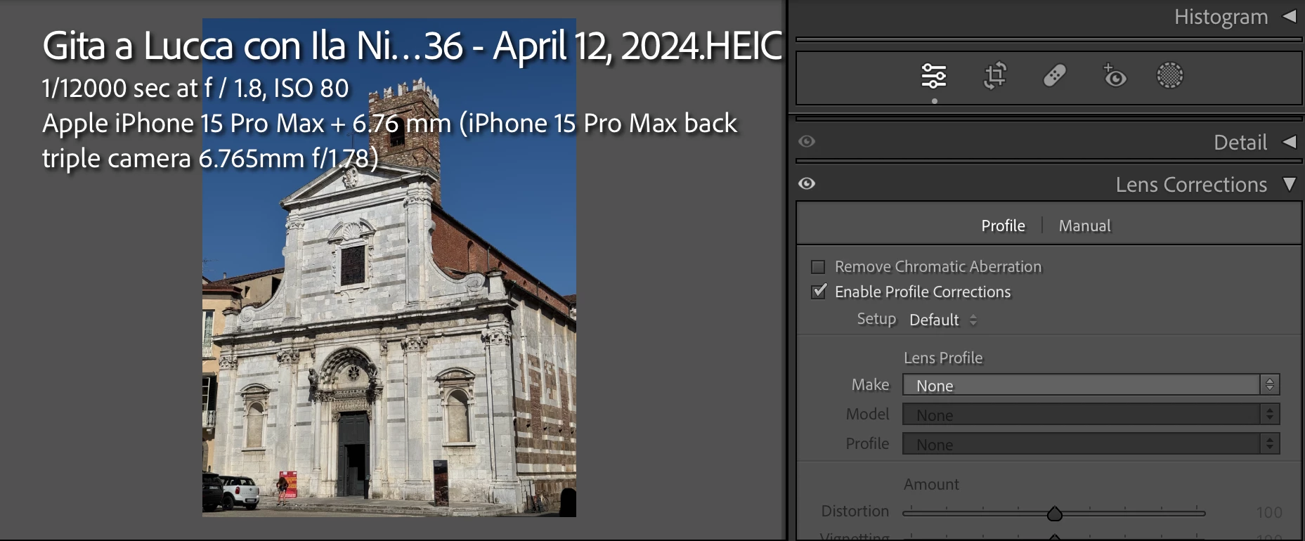 The Iphone 15 Pro Max main camera supposedly has a physical focal length of 6.86 mm, according to this dpreview.com article. LR / Camera Raw provide a lens profile for the 6.86 mm lens: