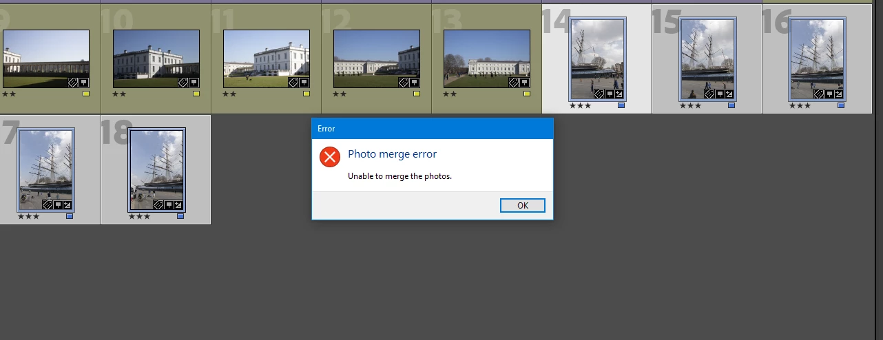 Another intermittent issue is when applying 100% boundary warp, then attempting to complete the merge using either Spherical or Cylindrical projections. Often, but not always, the result is an error as per this screenshot:
