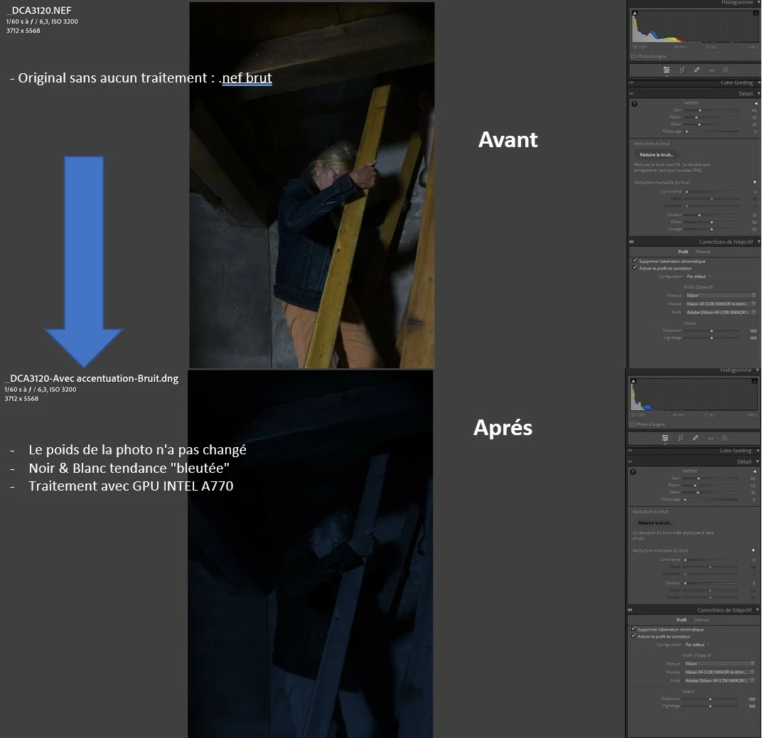 Lorsque j'utilise la "nouvelle" réduction du bruit avec CAMERA RAW 15.3 à partit d'un fichier .nef non édité, brut sortie d'un nikon Z6II ou Z7II ou D500, j'obtiens un fichier .dng monochrome bleuté sans réduction de bruit, le poids de la photo ne change pas. Ce probléme arrive sur LRc 12.3 et Ps 24.5. (ce problmé arrivait dans la précédente version et sur la version BETA de Ps). Je travaille sous windows 11, 64Go de RAM DDR5, ma carte graphique est une INTEL A770 dont les pilotes sont à jour.