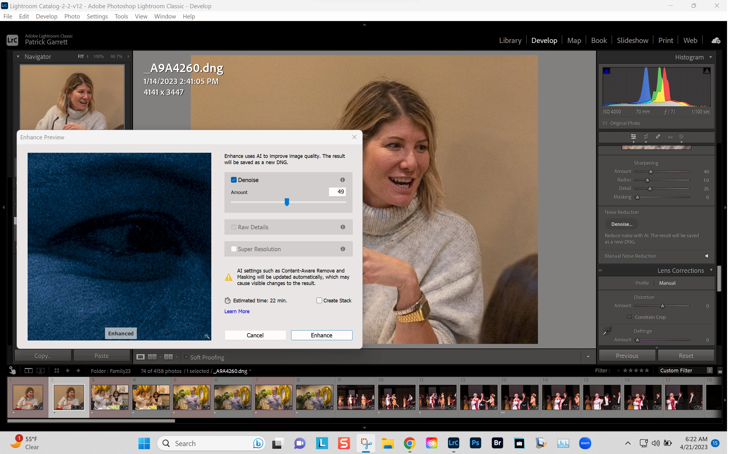 New Denoise not working.  I'm running LC12.3 recent upgrade.  the preview and saved DNG are sort of a B&W version (see attached screen capture.)  I've tried the new denoise on several different file types (CR2 CR3 DNG ARW) all with the same result.