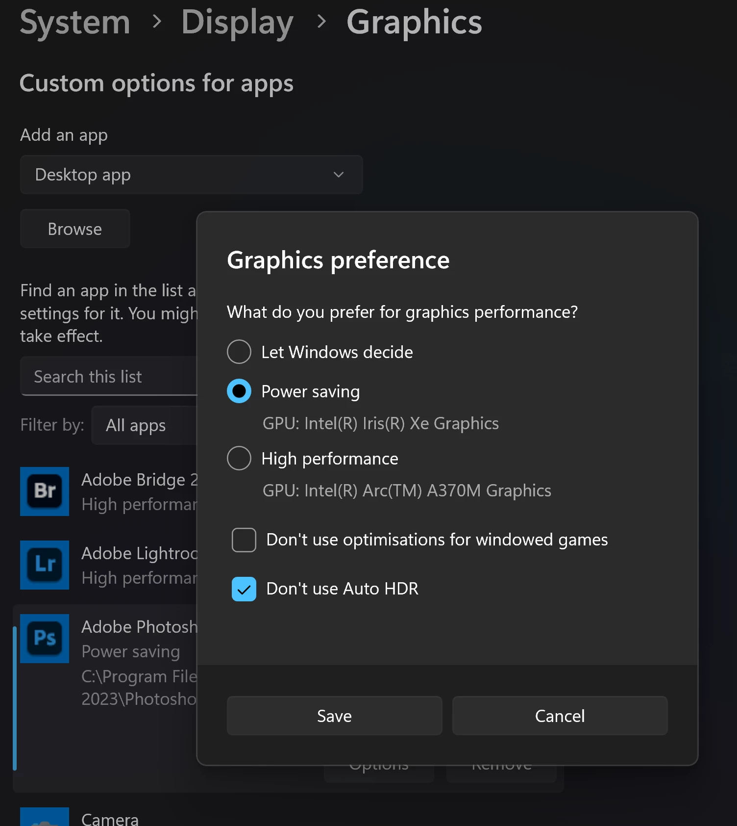 For me the culprit is clearly my discrete GPU (Intel Arc A370M), as I've now established that my integrated GPU (Intel Iris Xe) can perform AI denoise without issue (done by customising graphics setting for Photoshop to 'Power Saving', see screenshot). I'd been having the same problem where AI denoise progressively darkening images and stripping almost all the color out. However, I noticed that occasionally it would work. It then occured to me that ever since I've had the laptop (about 3 months) photoshop would randomly and periodically switch to the integrated GPU (prompting a warning), despite me customising the app as 'High Performance' to use the discrete GPU. Doing so purposefully then solved the issue. In my uneducated opinion there's clearly an issue with Photoshop and Intel Arc GPUs that goes deeper than just the AI noise feature.