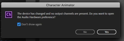 Switching monitors and auddio devices on a mac and pc causes a ton of these pop up boxes. Even when I select do not show again, I'm stuck having to close 10+ of these every time using Character Animator. I switch screens, audio devices (headphones to monitor) etc... a lot, so these add up.