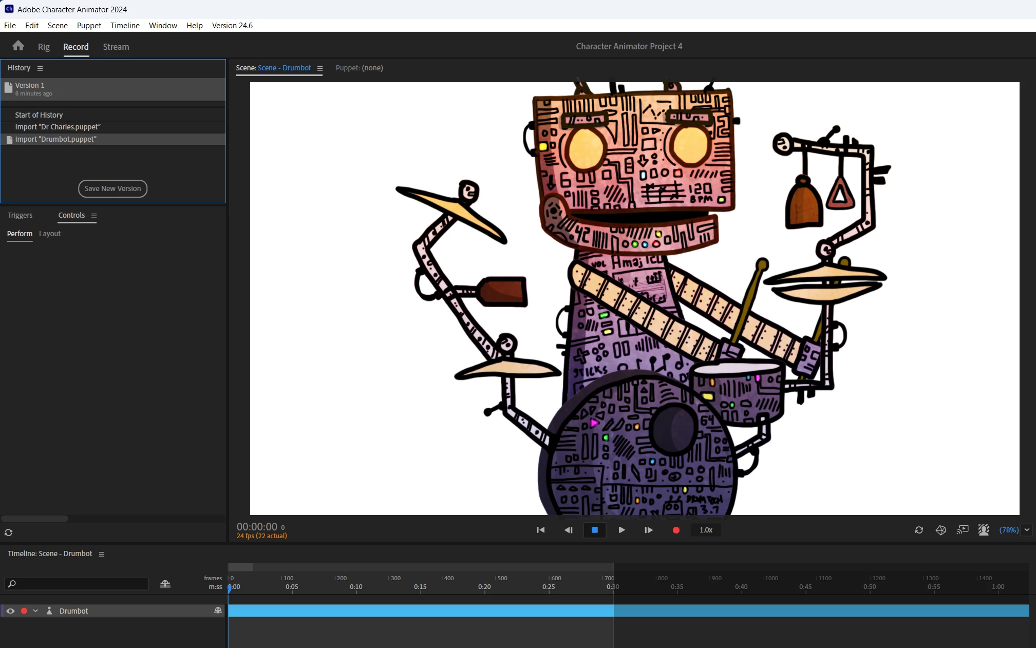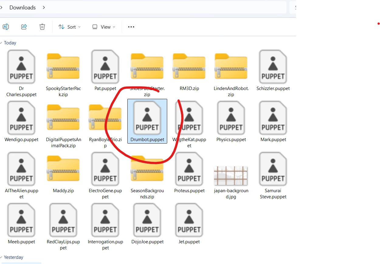 Attached are 3 screenshots. One shows all the puppets I imported into Puppet Maker by clicking on downloaded .puppet files. The next shows a new batch of .puppet files and my double clicking the drumbot.puppet. The last shows that instead of opening up within Puppet Maker the drumbot now opens directly into Character Animator in a new timeline.