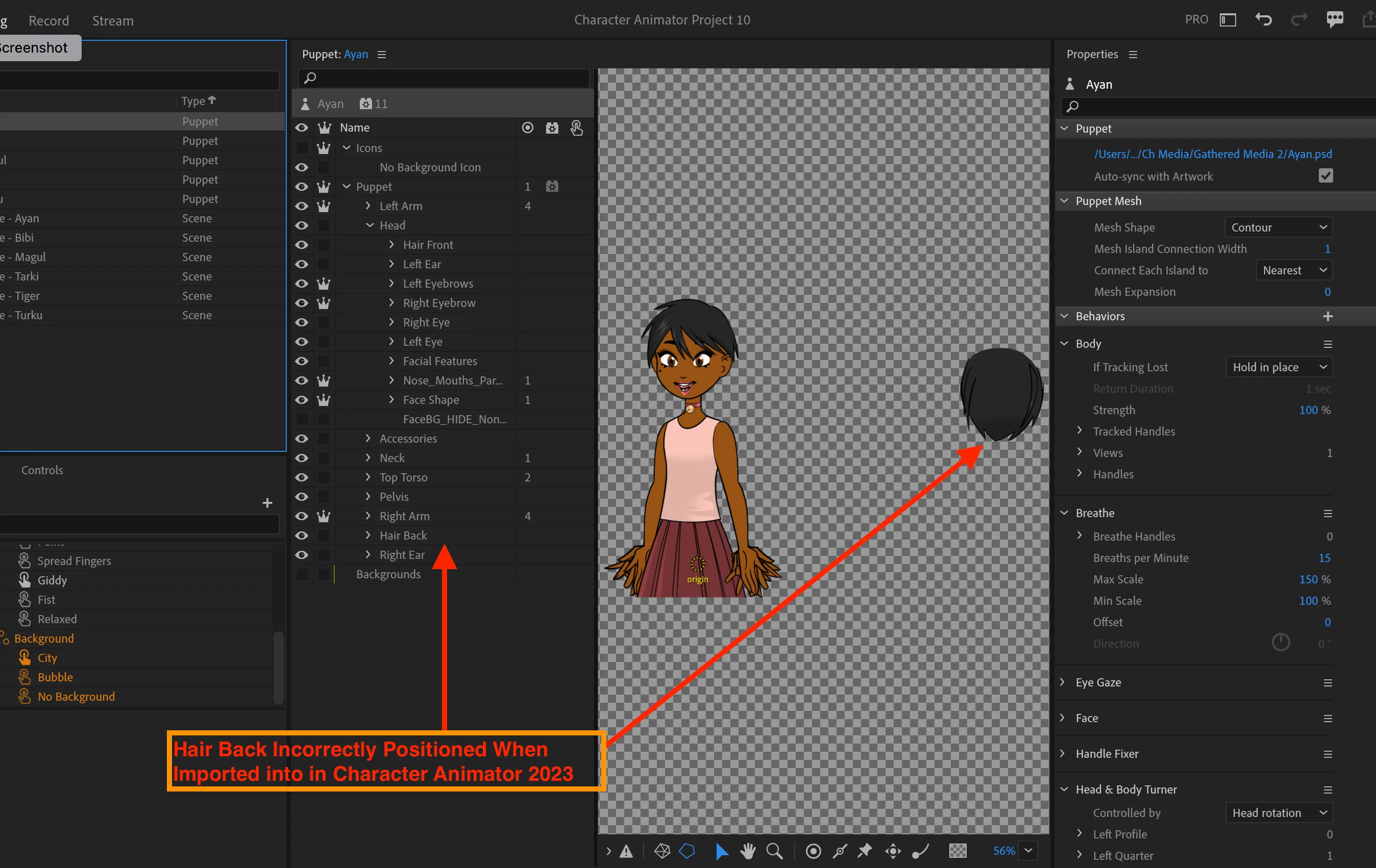 I've included Screenshots from Photoshop and CA. (I tried uploading the Puppet file, but the system wouldn't accept its fileType).