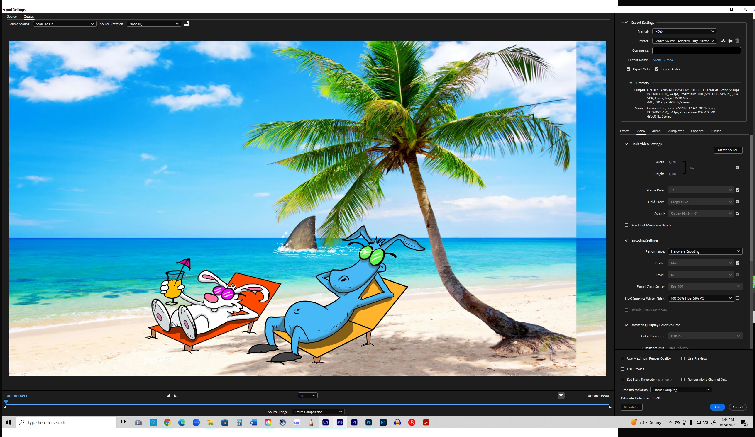 In character animator, everything is set to 1920x1080 for the scene, when I transfert through Media Encoder, the background image appears to be cut off and repeated towards the right. The left side of the frame has been cut off and moved to the right side of the frame. Artwork is all centered in Ch at 1920 x 1080 as you can see.