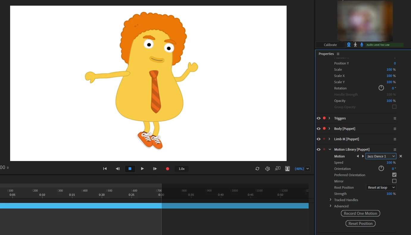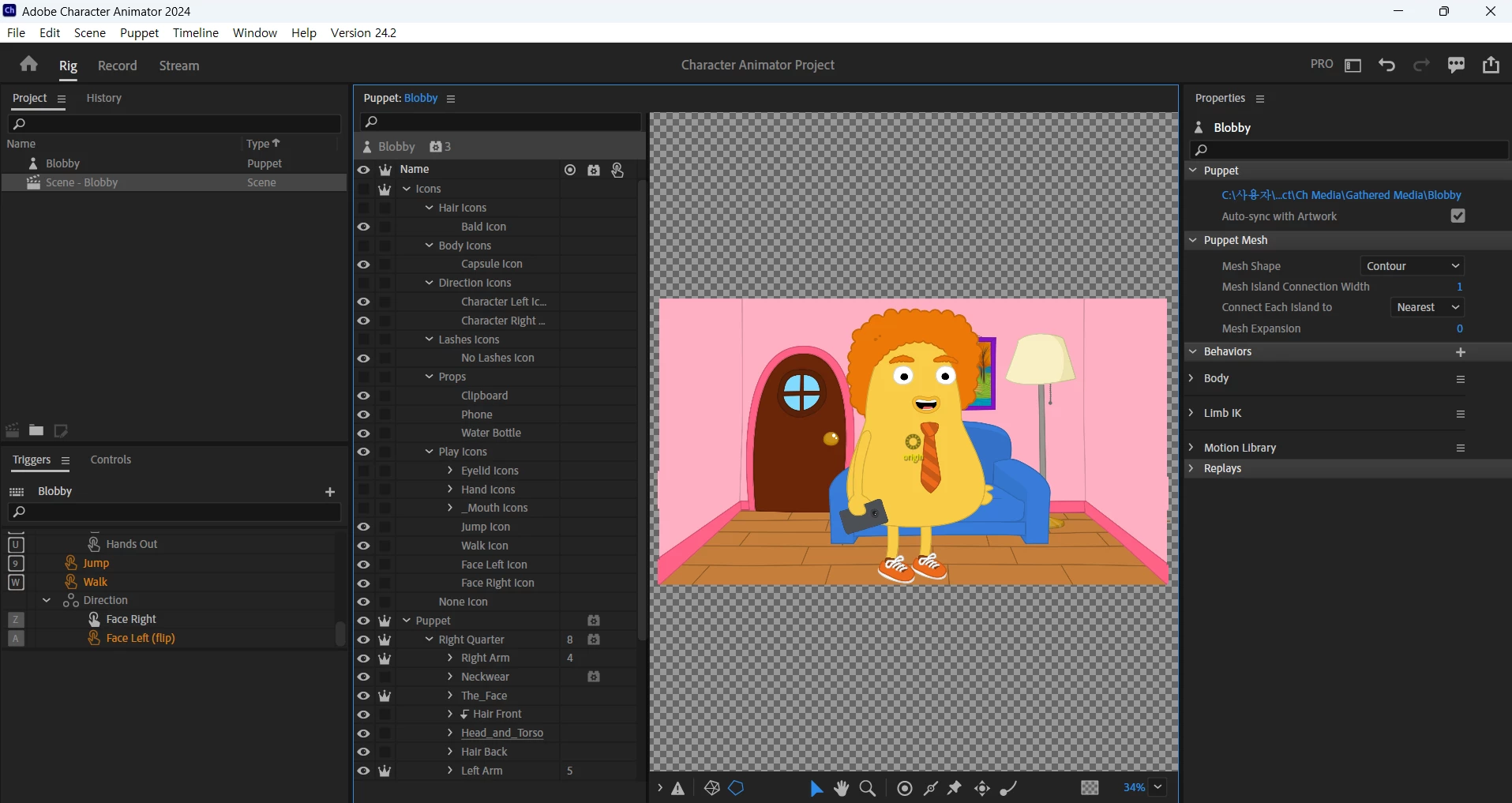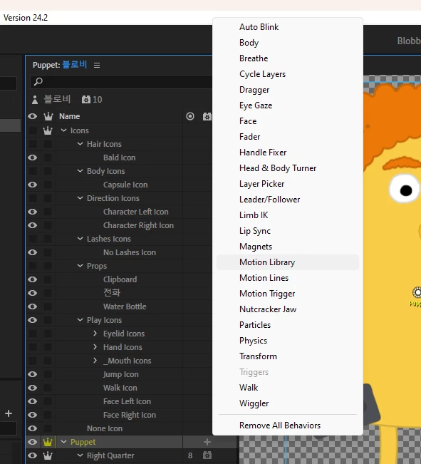 I am using the motion library well by applying it to a puppet called Blobby provided by Adobe. This time, I tried to change the shape of this Blobby Puppet and apply it in the same way, but there was no response at all. When I apply the body and limbs to the behavior and use the motion library, there is no response. Even if I delete all the behavior items and reapply the body, limbs, and motion libraries, there is no response at all. When applied to other puppets on other sites, it works as a motion library, but Adobe puppets such as Mega Robot and Blobby do not work, so there appears to be a problem.