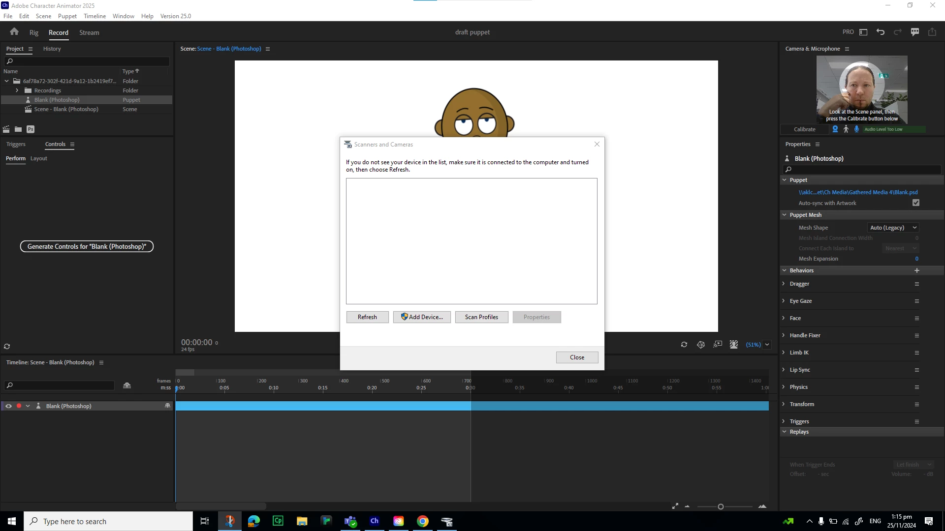 I'm unsure what's triggering this as it hasn't happened with any of the other puppets i've built in the past and as you can see the camera is working (top right) and I don't use a scanner.
