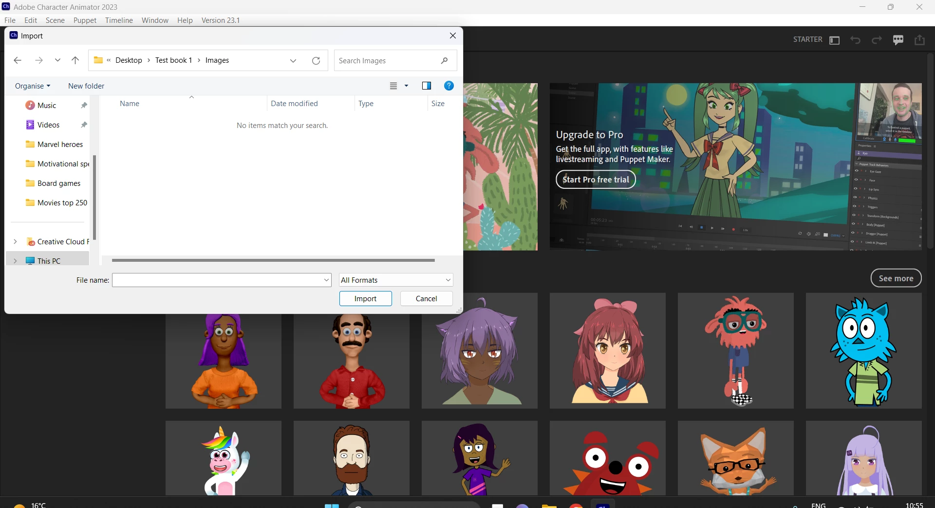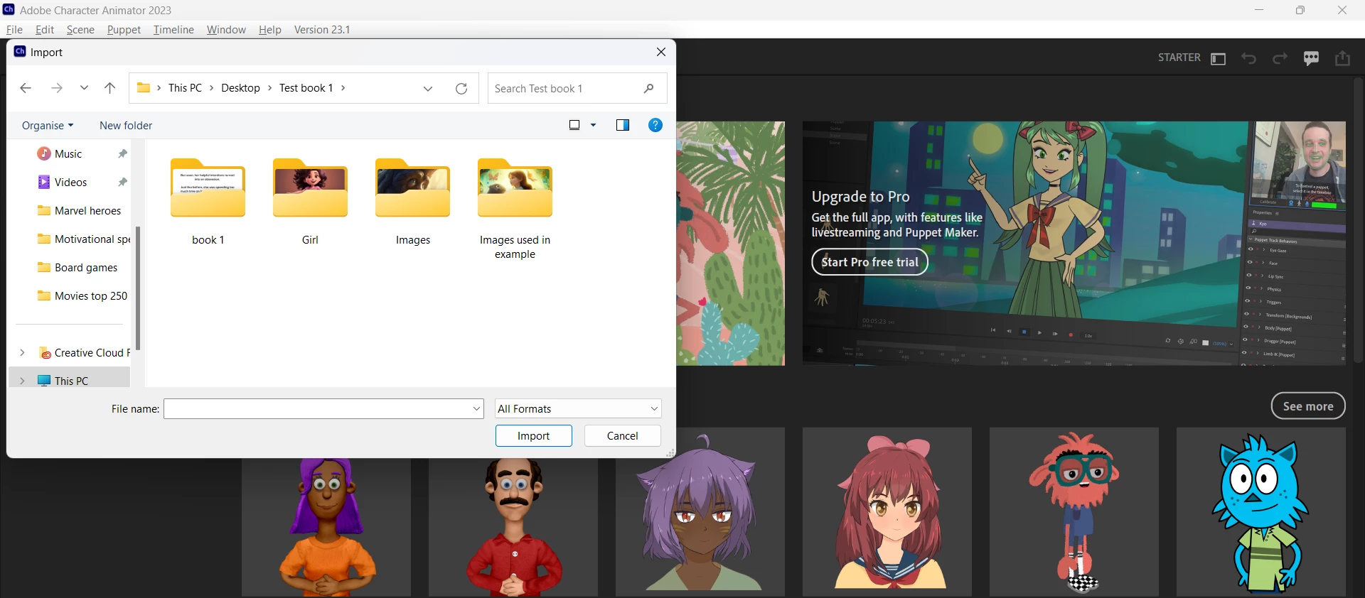 I'm using the free trial version of Character Animator, but I experience issues with importing a file like a .PNG, .PSD and .AI file. Regarding .PSD files, I converted a PNG file into a .PSD and .AI file by using online tools like psd converter, but when I click on "import" in Character Animator, the files aren't visible to select. I don't have .PSD files created in Photoshop so I can't try such files. What could be the problem?