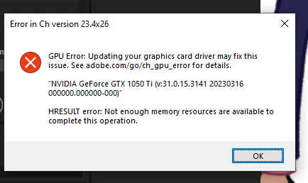Windows PC, 16 gb RAM, GTX 1050 Ti, Version 23.4 (Build 26)