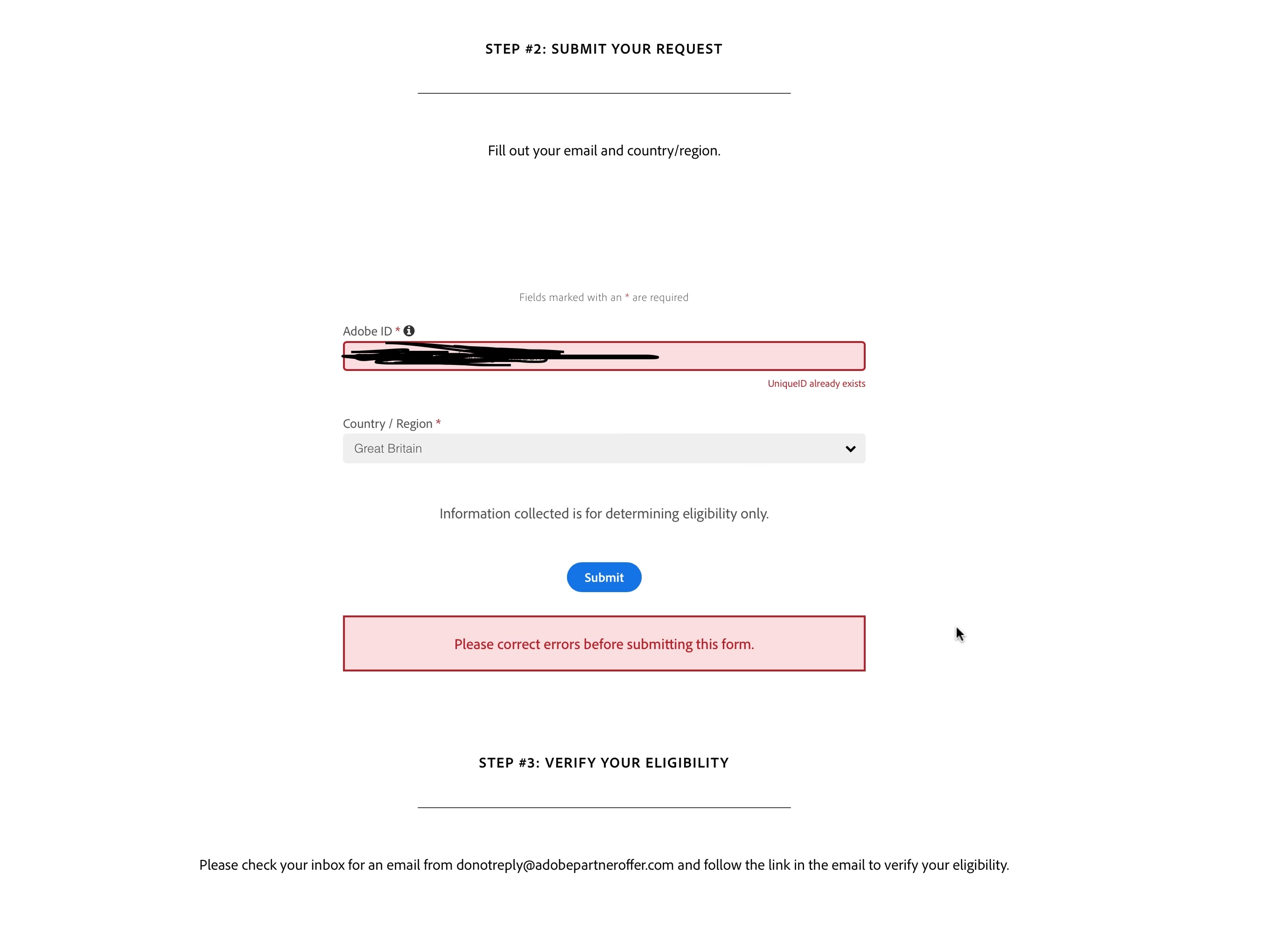 Hi I'm a student in university and i'm trying to put a request for the substance painter program but when i'm filling in my Adobe ID/Email i keep getting an error message telling me my UniqueID already exists and that i need to correct errors before submitting the form which is odd as I'm using my account email