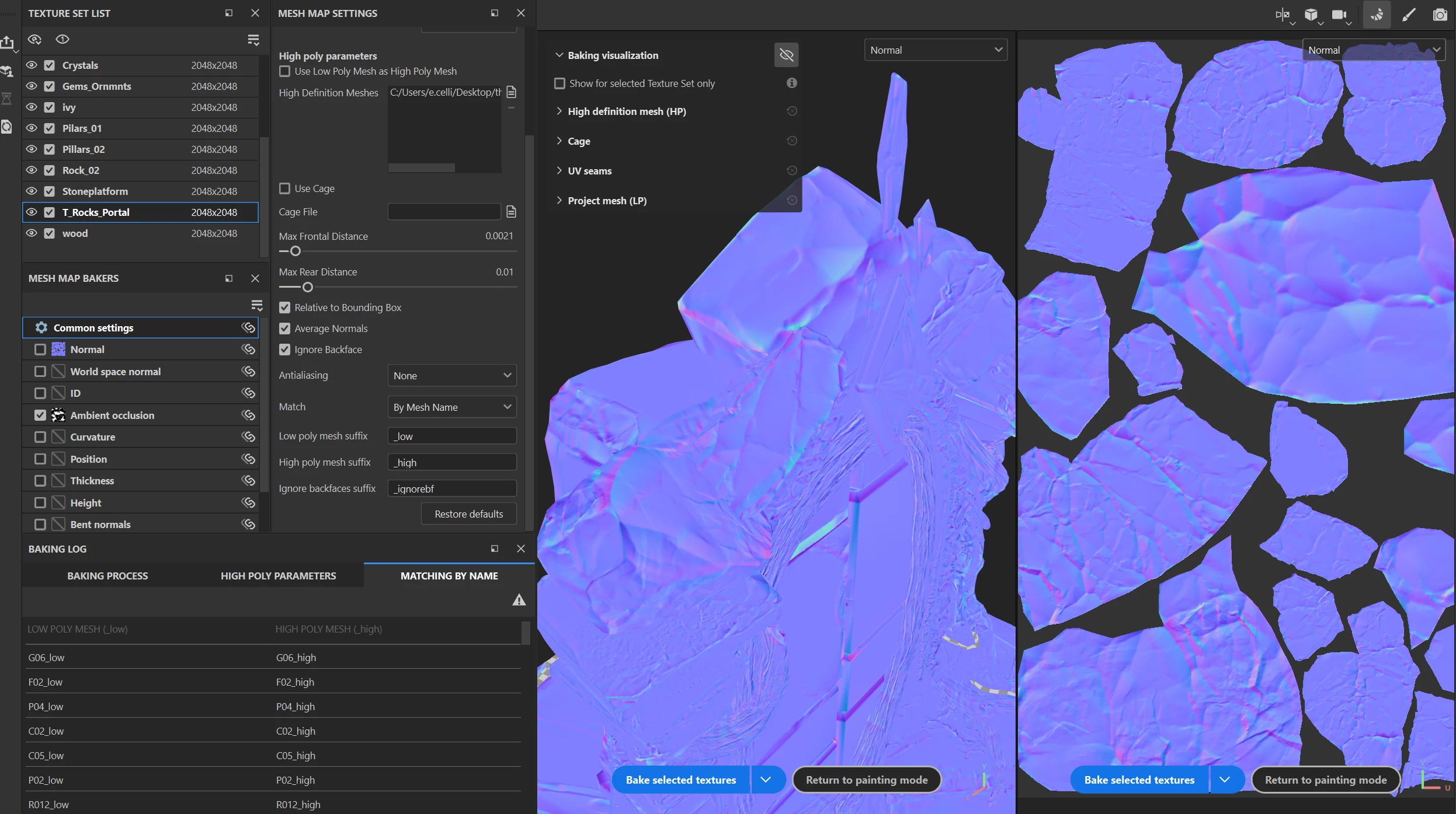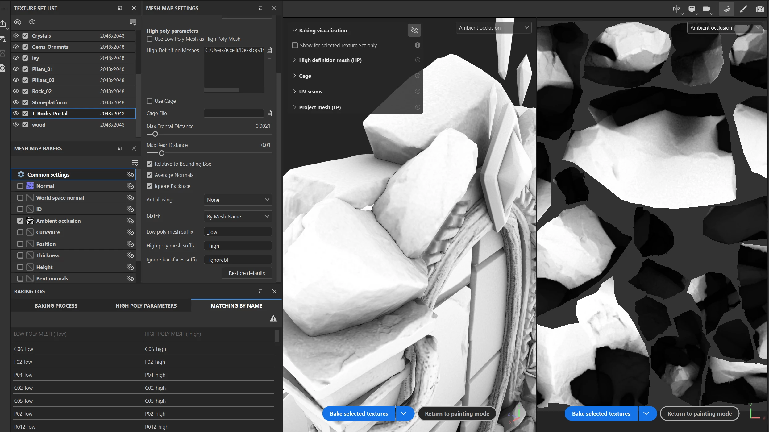 I'm having a really weird issue and never encounter it before, when I bake by mesh name (all the name are correct, indeed I have no warning too, see pictures) only the normal map is baking correctly (see picture) while the AO and Curvature are not, taking in account the rest of the meshes.