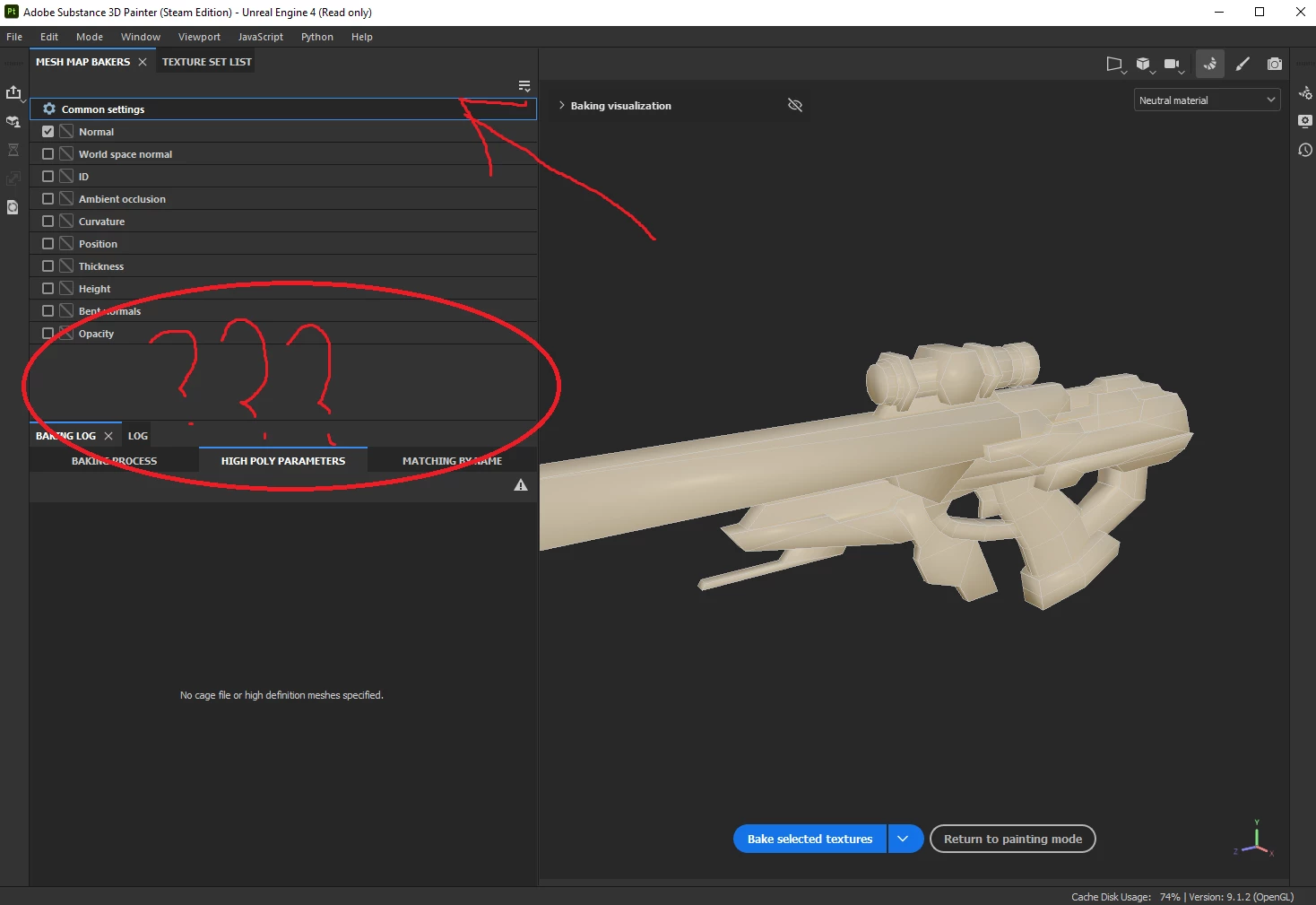 Where I select the highpoly model, and edit the distances. Now I have tried to click all the little buttons. and look at any short cuts that may have hidden anything. Please help. I just want to bake my models.