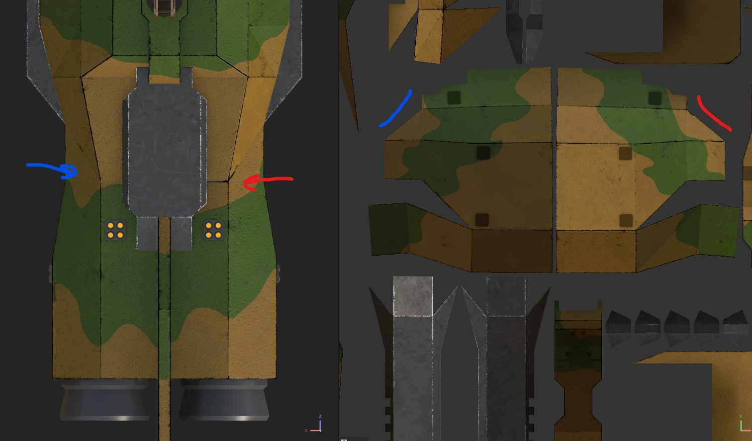 I am encountering an issue where auto-baked curvature maps are generating inconsistently on a symmetrical model. This has resulted in the issue below, where edge wear is asymmetrically applied on the back of the model. Red is where it has applied, blue is where it has not.