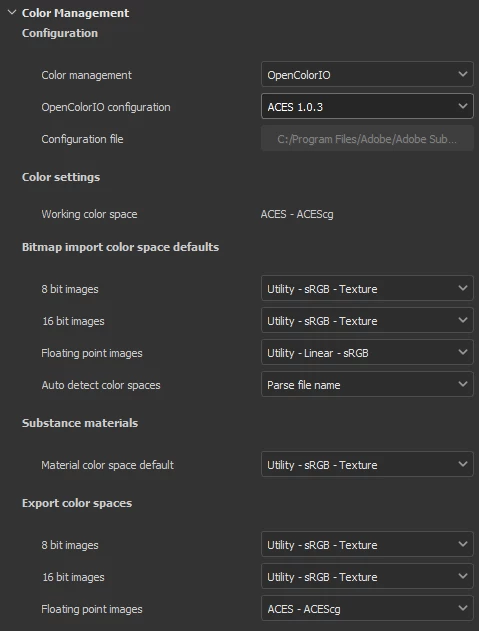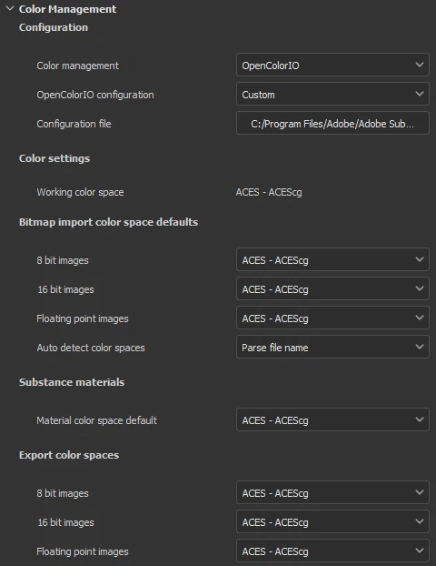 If I switch to custom and point to the same file inside the install folder (C:\Program Files\Adobe\Adobe Substance 3D Painter\resources\ocio\aces_1.0.3\config.ocio), then everything below gets set to the same value as scene_linear value, which in this case is ACES - ACEScg.