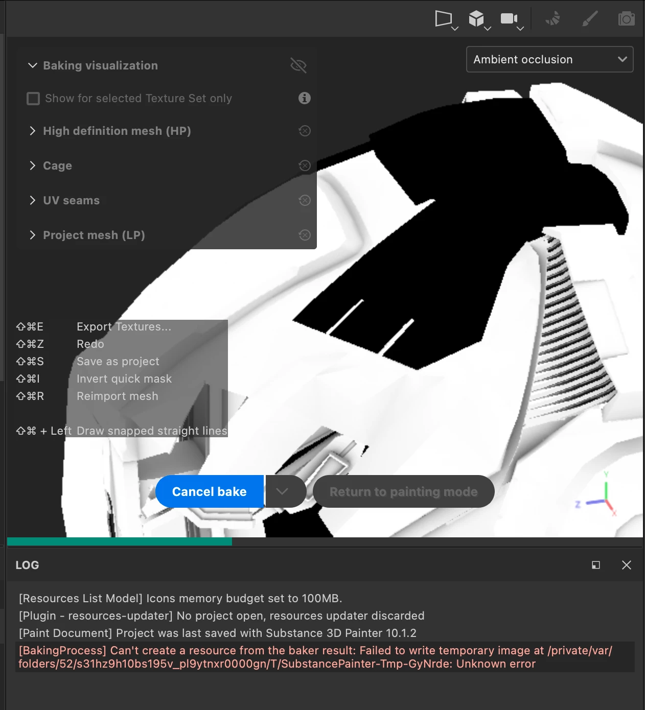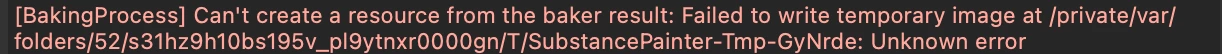 I have recently been trying to bake from hipoly to lowpoly. However, I have begun to run into the error: "[BakingProcess] Can't create a resource from the baker result: Failed to write temporary image at /private/var/folders/52/s31hz9h10bs195v_pl9ytnxr0000gn/T/SubstancePainter-Tmp-GyNrde: Unknown error".