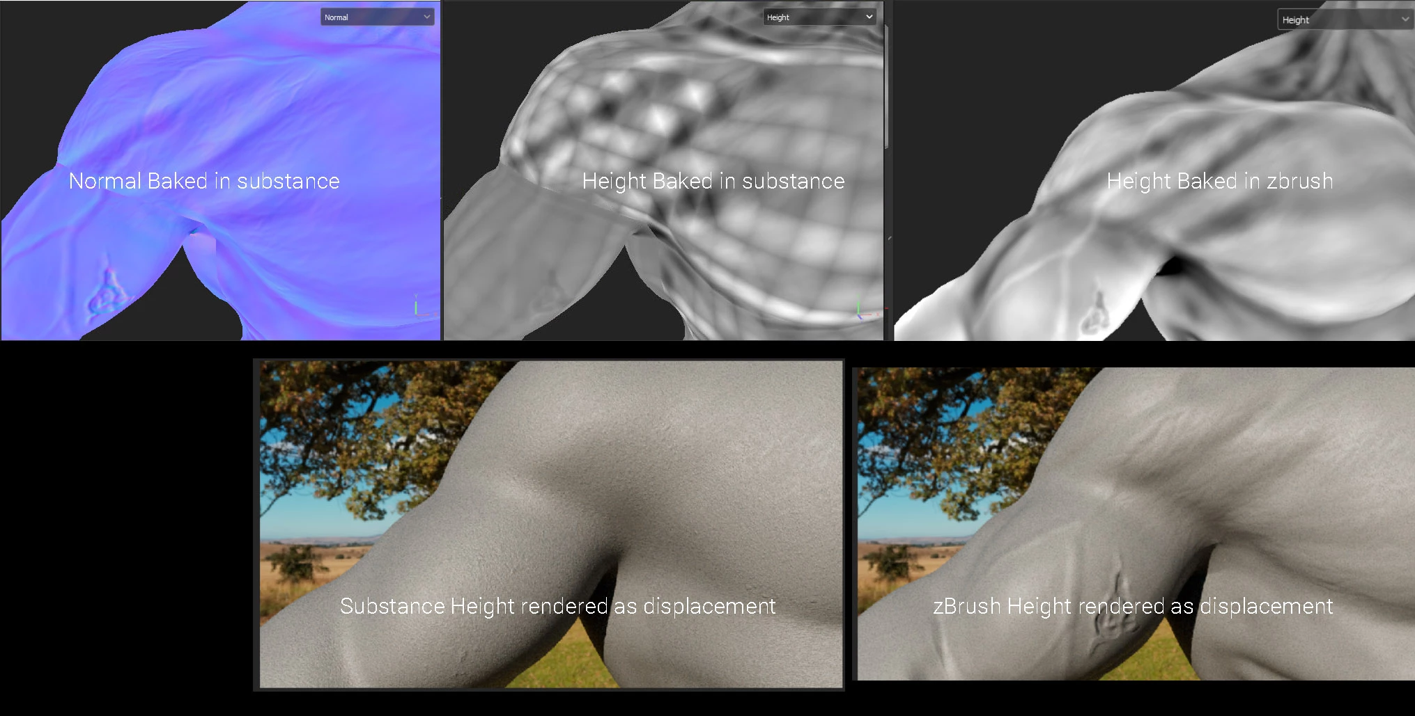 Thanks for the pictures, it has created an interesting talk with the team. The render you got with the height map from Substance 3D Painter should be closer from the one with Zbrush. What was your workflow for exporting the map? Did you export it with 16 bit depth? Do the scale was the same between the two renders?