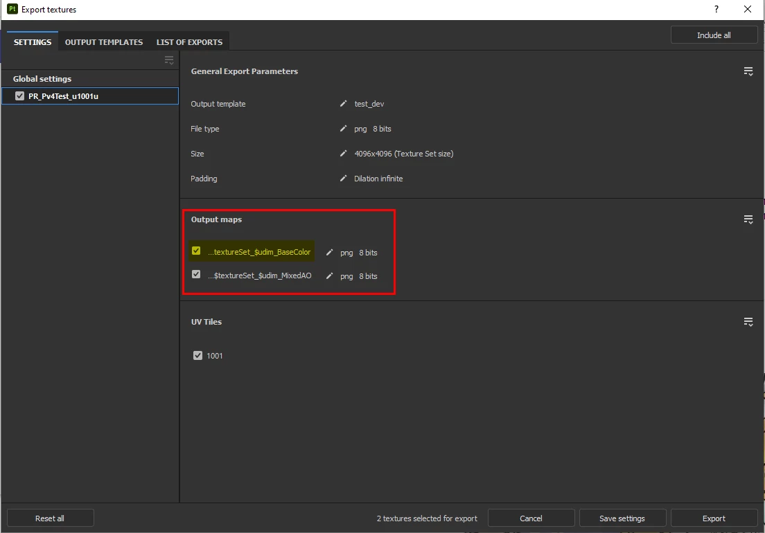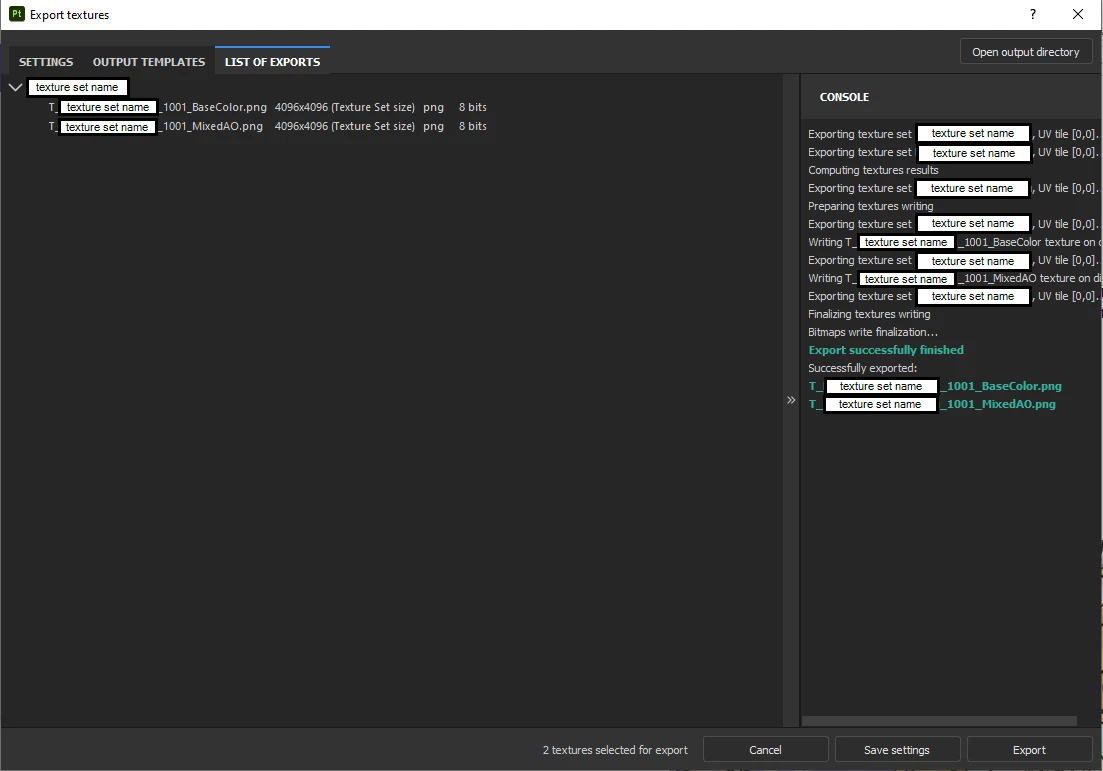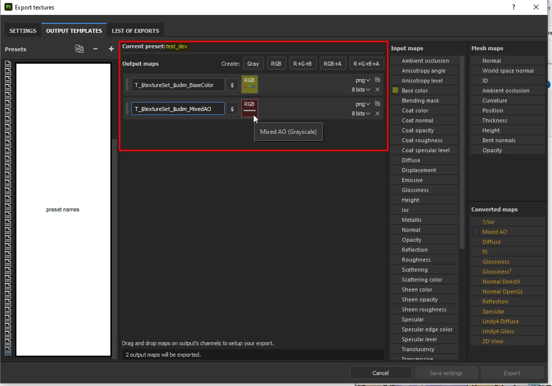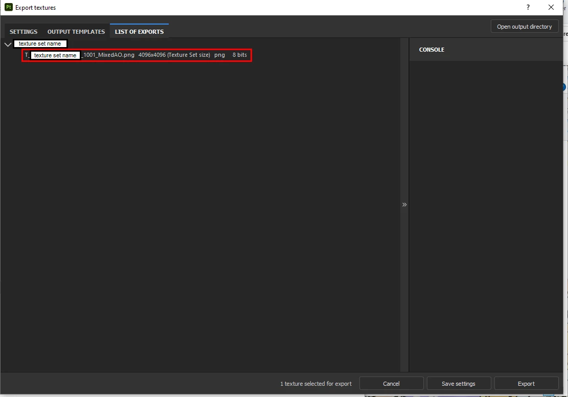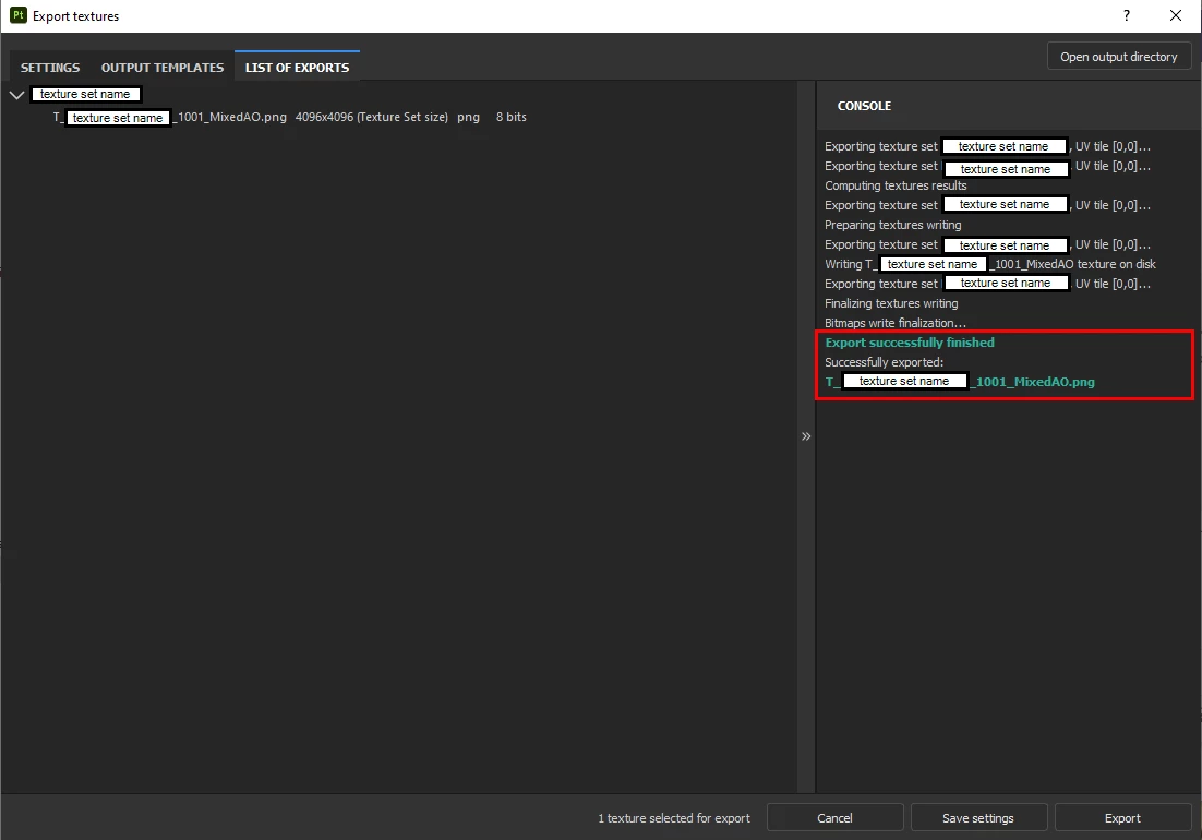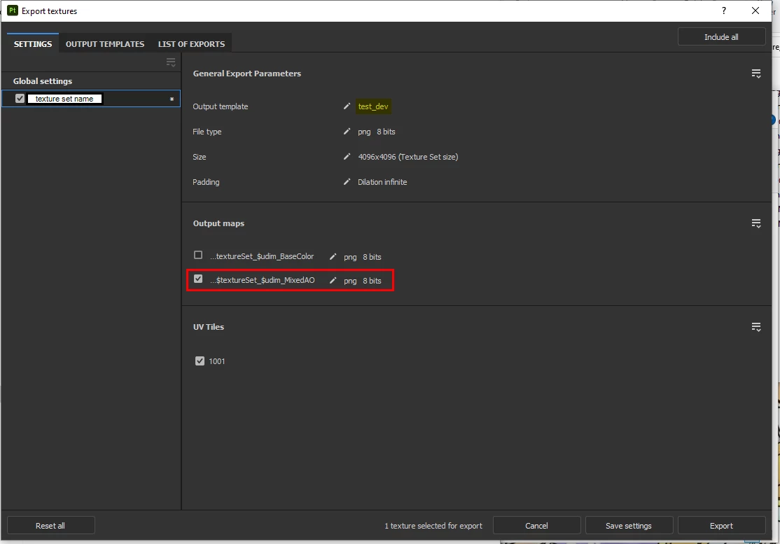 The template I am using to export the textures has several output maps, including one with ambient occlusion info (RGB "Mixed AO" - Grayscale). I want to export for each of my texture sets only the output map for ambient occlusion.
