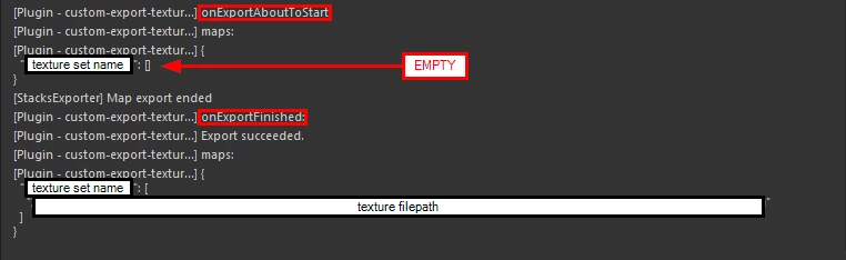 If I display the value of the variable "maps" in a Javascript plugin in function "onExportAboutToStart()", I get a dictionary with the texture set names as keys, but no value (we should get the texture filepaths as we get them in function "onExportFinished()")...