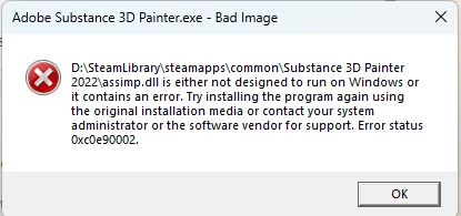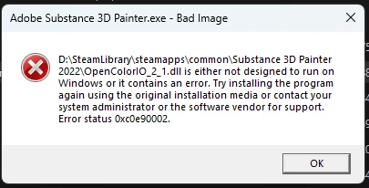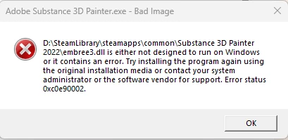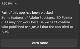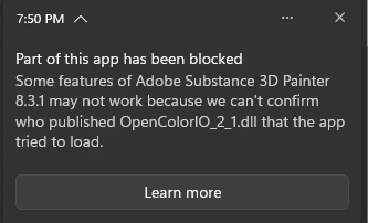my Steam copy of Substance Painter 2022 was working fine until yesterday (22/11/24), but sudently today it wont open and an error for 4 dll's appears that reads: ''Some features of Adobe Substance Painter 8.3.1 may not work because we can't confirm who published (DLL) that the app tried to load.''