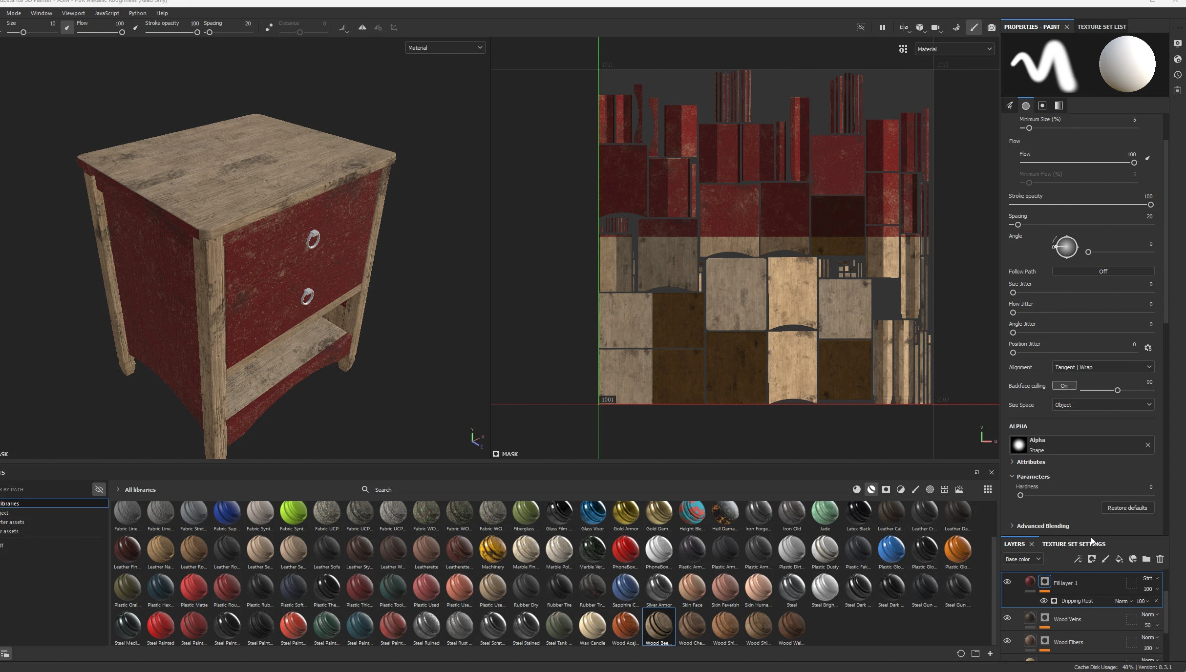 I encountered an issue while attempting to apply smart material to my model. It resulted in weird artifacts appearing, giving the impression that my UV map had been burnt onto the model. I discovered that the problem lies with the layer utilizing the saturation blend mode. It appears that any smart material having layer with the saturation blend mode will exhibit various types of artifacts. To illustrate the problem, I have attached two GIFs showcasing the issue.