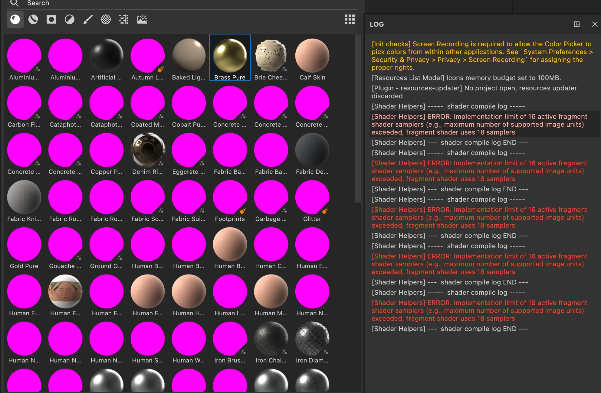 Materials have gone pink on me,  including some from the starter assets which i never used.