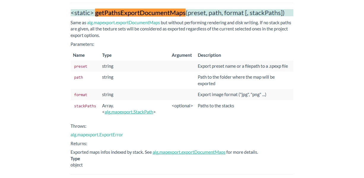 substance_painter.js.evaluate('alg.mapexport.getPathsExportDocumentMaps("export-preset-generator://viewport2d", "/path/to", "png", [])')