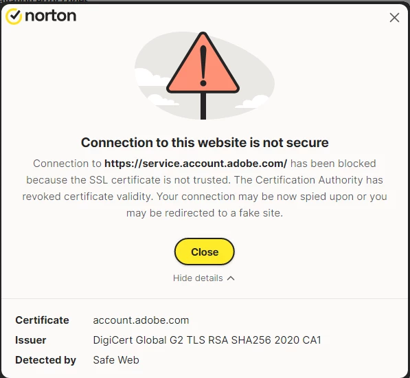 What's wrong with the SSL certificate for service.account.adobe.com?