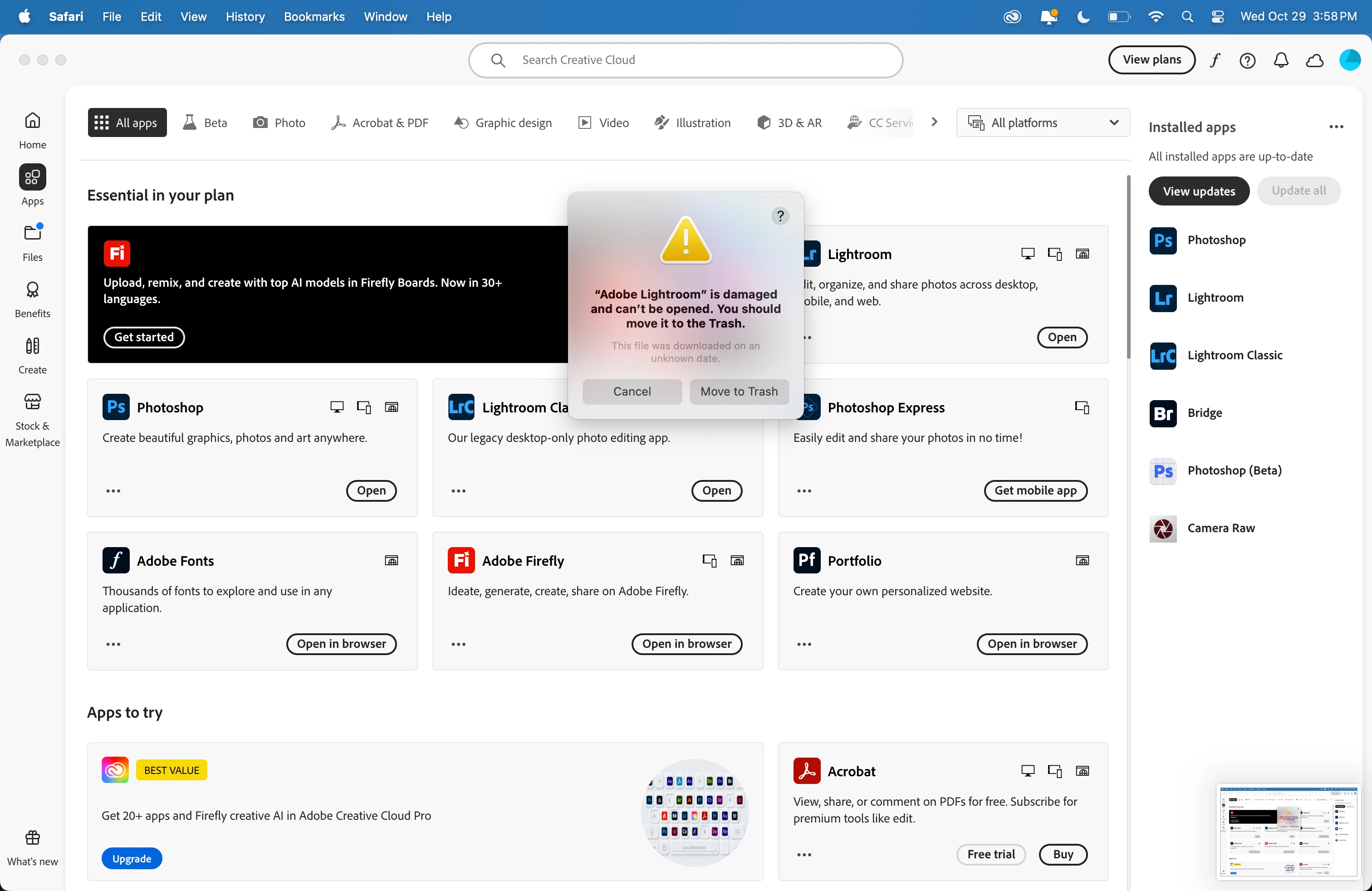 Just updated all my subsciption apps. tried to open all and had issues with lightroom CC. I uninstalled it only to have LRC get uninstalled. I was able to reinstall LRC but still having the same error message trying to open LR. I tried multiple times. All was working fine prior to the updates. Any help appriciated. - Thanks
