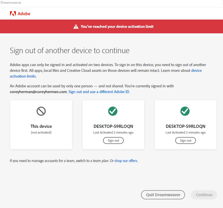 Actual result: I get the activation limit warning that I've included as a screencap