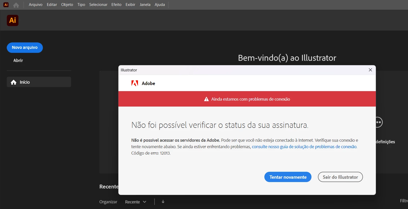 Ao abrir o Illustrator aparece esse erro, não consigo resolver de jeito algum. Uso o windows 11 e está atualizado. Não entendo poque está acontecendo isso, pois no dia anterior estava tudi funcionando perfeitamente bem.