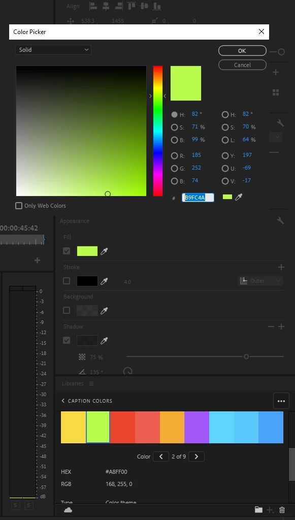 I have a color theme that I use inside of Premiere Pro, to which I’ve imported to Libraries, that I use to quickly apply color variations to captions in Essental Graphics via eyedropper.